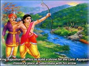 Manikandan told the king it was the time for him to return to Devaloka as the task for which he took the incarnation was completed. As Lord Ayyappan was very much pleased by the devotion of the king, he asked what boon the king wanted from the Lord. The king at once replied that he would like to raise a temple in his memory. He asked a suitable place for the temple. Manikandan threw an arrow which fell at a place called Sabari, where a Sanyasini (a female saint) called Sabari undertook penance during the period of Lord Rama.